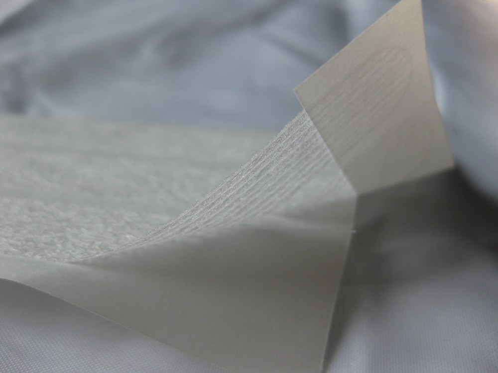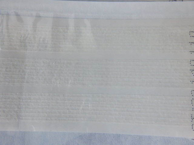 4. The waterproof breathable dressing by the substrate printed with 3M from the paper tore down, in order to avoid the seam tape is covered on the, from center to the edges smooth, not Korah pull dressing. (Figure d)
